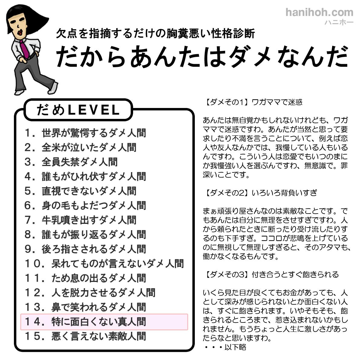 このような隅のほうまで興味を持っていただいたことに感謝します。ハニホーがどれほどのことを考えて診断しているかを理解するには、開設された「人生屋さん」をご覧ください。恋愛や性格の深~い世界が垣間見られますよ。